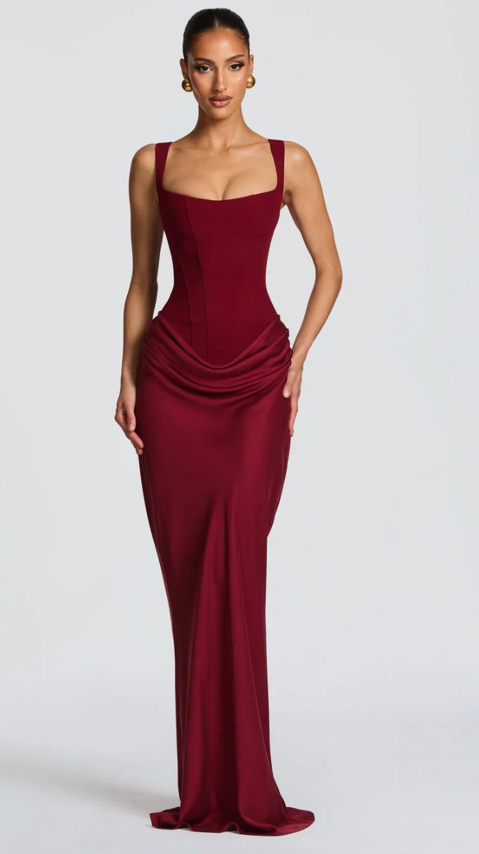 Cornelia Maxi in BURGUNDY showcases architectural design with a structured crepe bodice and fluid lyocell skirt. The square neckline and tapered straps frame the boned silhouette, while the dropped waist transitions into a satin cowl overlay adorned with deep pleats. An adjustable lace-up back ensures a personalised fit.